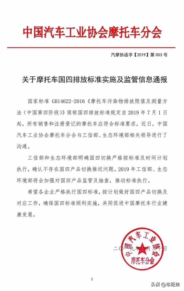 2月份,摩信網(wǎng)收到了關(guān)于摩托車排放升級的通報文件。中國汽車工業(yè)協(xié)會摩托車分會發(fā)布的通報稱,自2019年7月1日起,所有銷售和注冊登記的摩托車都應(yīng)滿足國四排放標(biāo)準(zhǔn),確認(rèn)不存在國四車型推遲的消息。